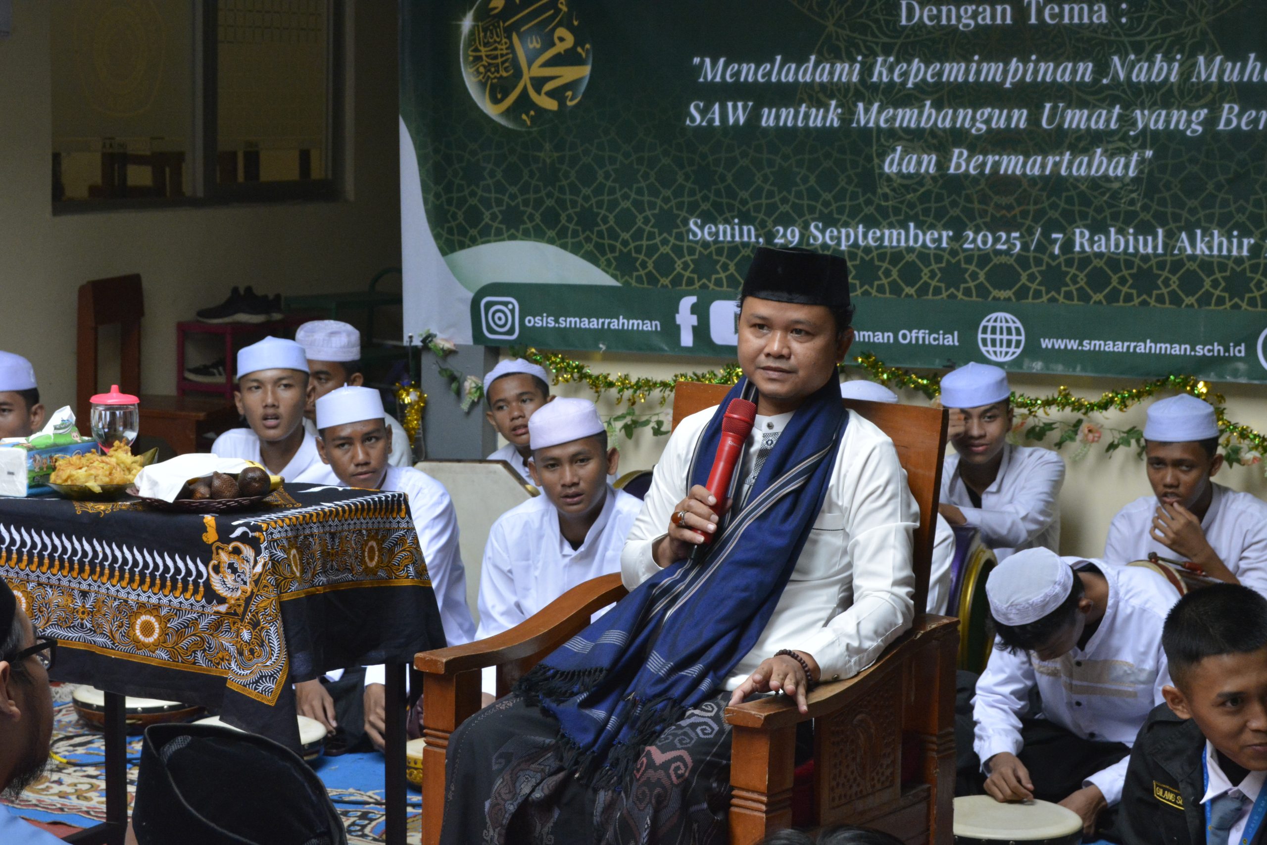 Perayaan Maulid Nabi Muhammad SAW tahun ini mengusung tema “Meneladani Akhlak Nabi Muhammad SAW dalam Membentuk Generasi Berkarakter dan Berakhlak Mulia.” Kegiatan dimulai dengan pembacaan ayat suci Al-Qur’an, dilanjutkan dengan shalawat dan tausiyah yang disampaikan oleh ustaz tamu. Dalam tausiyahnya, beliau mengingatkan pentingnya meneladani sifat-sifat Rasulullah seperti kejujuran, kesabaran, kasih sayang, dan tanggung jawab — nilai-nilai yang sejalan dengan semangat pembentukan karakter pelajar di SMA Arrahman Depok. Suasana haru dan khidmat terasa saat seluruh siswa bersama-sama melantunkan shalawat Nabi. Tidak hanya sebagai seremonial, peringatan ini juga menjadi sarana refleksi diri agar setiap siswa mampu meneladani ajaran dan akhlak Nabi dalam kehidupan sehari-hari, baik di lingkungan sekolah maupun di luar sekolah.